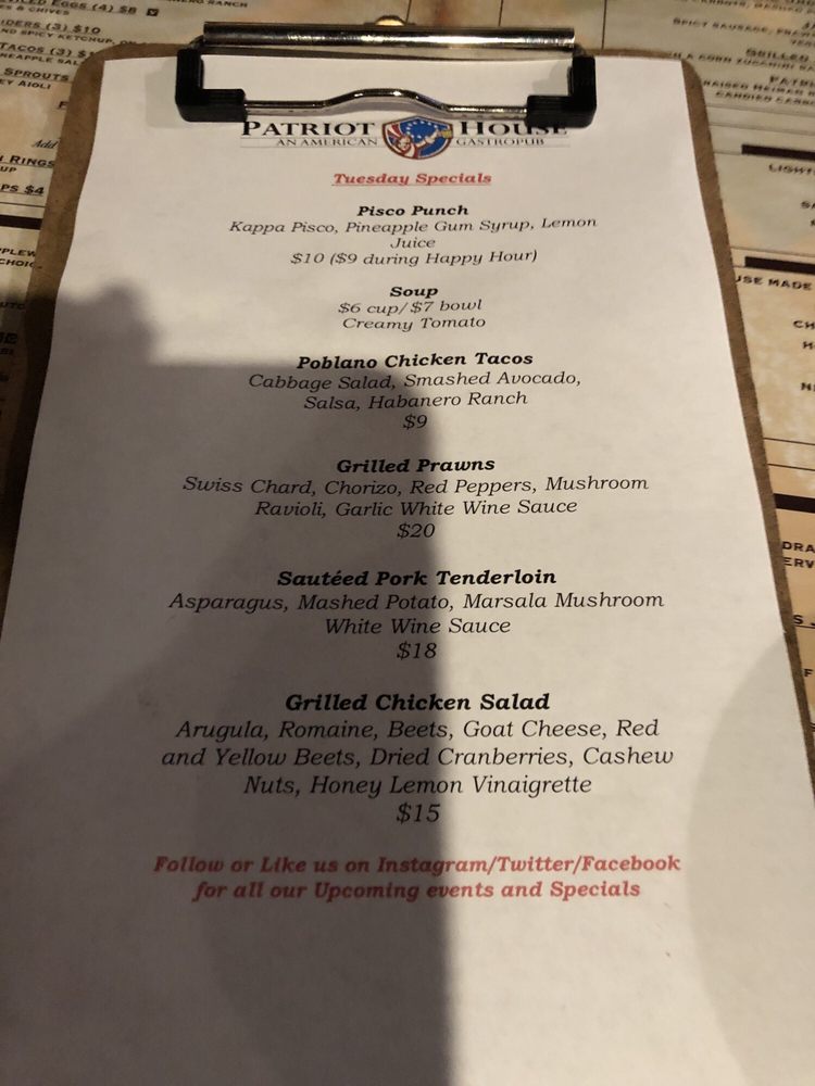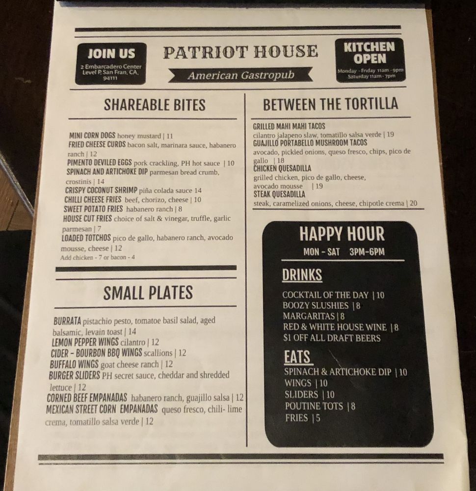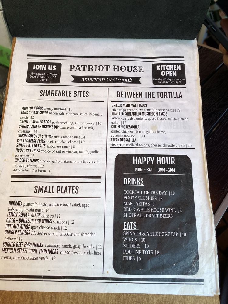 Patriot House, located in San Francisco, is a gastropub offering a range of services and amenities. With a variety of options for seating, including outdoor patio seating, and a welcoming atmosphere, Patriot House is a great spot for larger groups or casual hangouts. The menu features traditional bar food like tatchos and wings, along with daily specials and happy hour deals. Customers rave about the lemon pepper wings, sliders, and spinach and artichoke dip. The bar offers a selection of drinks, from standard options like Trumer Pilsner to more unique cocktails like the State of the Union. Overall, Patriot House is known for its friendly service, good food, and comfortable setting, making it a hidden gem in the Embarcadero Center. Grab your friends and enjoy a night out at Patriot House for a memorable experience.